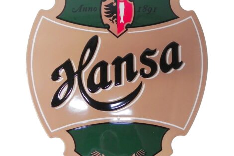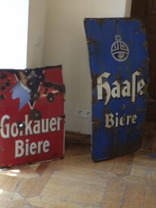 Emaliowane szyldy z przedwojennego Wrocławia. Zapewne z jakiejś piwiarni. Widać gniazda korozji w miejscach uszkodzeń, a szczególnie w punktach przebicia tablicy przez pociski. Wystawa o przedwojennym Wrocławiu w salach Ossolinem