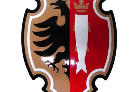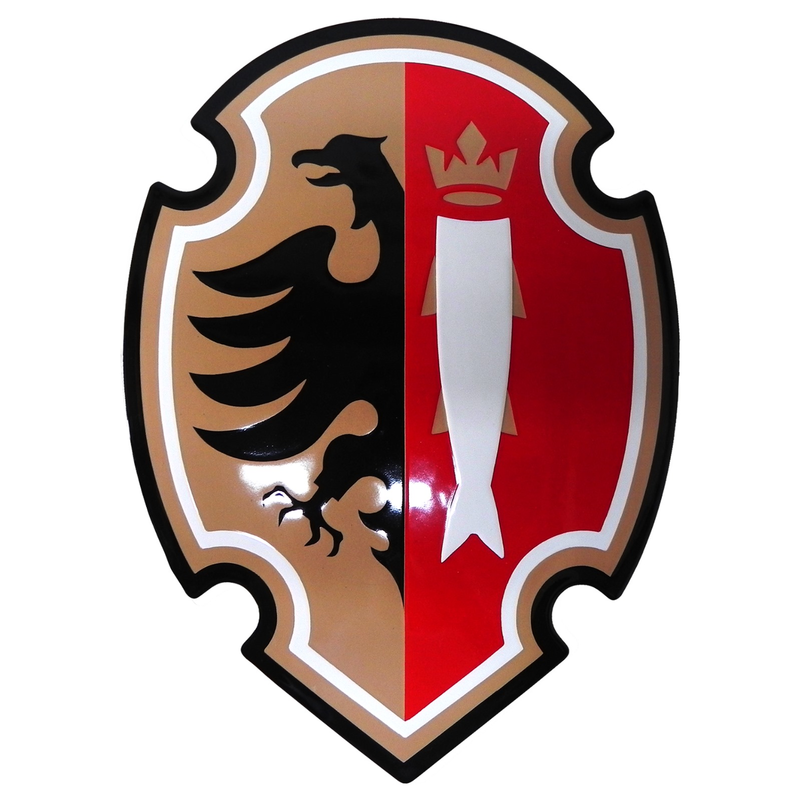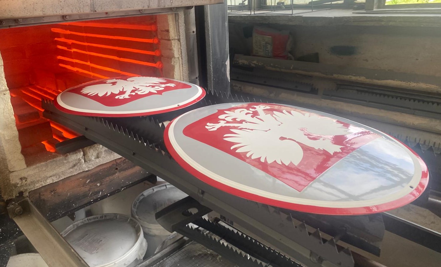 Przykład Godła Państwowego w trakcie wypalania kolejnej warstwy emalii. Do tej pory szyld wypalany był co najmniej 4 razy (emalia gruntowa, następnie kolory: szary, czerwony i biały) dla ostatecznego wykończenia konieczne będzie kolejne wypalenie koloru złotego korony i szponów. W szczególnych przypadkach gdy wykonuje się powtarzalną serię takich samych znaków wykorzystuje się technikę sitodruku z zastosowaniem specjalnych past ceramicznych – bardzo drobno zmielone barwione szkliwo przetarte przez walce jako zawiesina odparowujących olejków. Również tutaj stosowane są kalkomanie, które niejednokrotnie zakłady szyldowe wykonują we własnym zakresie. Jednak ze względu na jednostkowy charakter produkcji najczęściej za pomocą plotera wycina się szablon, który następnie służy do ręcznego odwzorowania napisu lub wzoru znaku przez szczotkowanie wysuszonej warstwy emalii. Gwarancją jakości i solidności wykonania jest doświadczenie producentów, którzy niejednokrotnie kontynuują zawody zgodnie z tradycją rodzinną. Jestem przekonany, że mimo pozornej różnicy w koszcie wykonania w technice emaliowania produkty tej branży posiadają znacznie wyższe zalety użytkowe – trwałość, estetyka, kolorystyka. Szyld emaliowany ze względu na powinowactwo do szkła ze względu na połysk i wyrazistość kolorów od razu rzuca się w oczy i wyróżnia się na tle innych tego typu produktów wykonanych innymi technikami. Trwałość powłoki i jej odporność na warunki atmosferyczne pozwala stwierdzić, że po wykonaniu „Testu Floryda” wszystkie produkty w technice lakierowania lub tworzywa sztucznego powłoki emalierskie o dziesięciolecia wyprzedzają pozostałe.